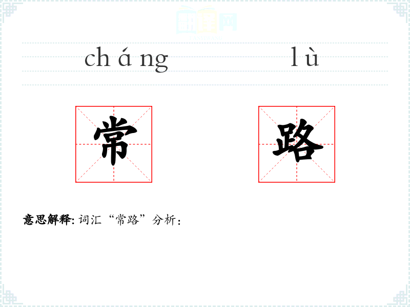 “常路”由“常”和“路”两个字组成。“常”意为经常、常规,“路”指道路。在古代文献中,“常路”一词已有使用,随着时间的推移,其含义基本保持不变。