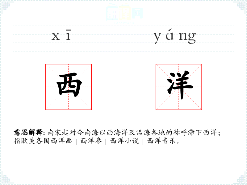 南宋起对今南海以西海洋及沿海各地的称呼滞下西洋; 指欧美各国西洋画|西洋参|西洋小说|西洋音乐。