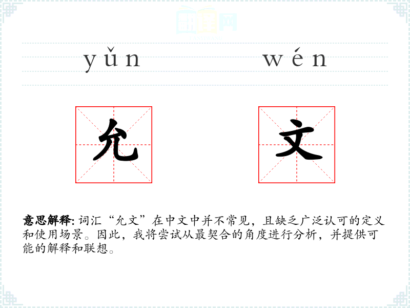 词汇“允文”在中文中并不常见,且缺乏广泛认可的定义和使用场景。因此,我将尝试从最契合的角度进行分析,并提供可能的解释和联想。