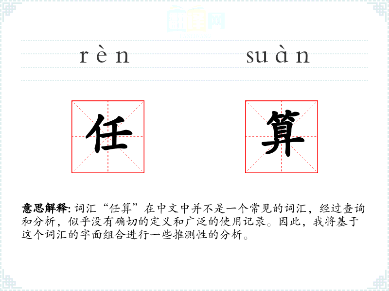 由于“任算”不是一个标准词汇,它在不同语境下的使用难以确定。如果强行解释,可能在某些特定的技术或数学领域中,它可能被用来表示某种不受限制的计算方式。