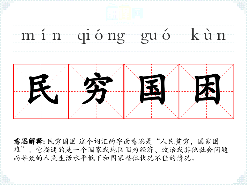 民穷国困 这个词汇的字面意思是“人民贫穷,国家困难”。它描述的是一个国家或地区因为经济、政治或其他社会问题而导致的人民生活水平低下和国家整体状况不佳的情况。