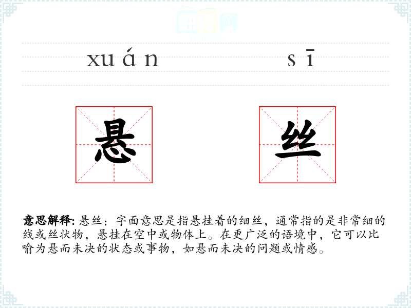 悬丝:字面意思是指悬挂着的细丝,通常指的是非常细的线或丝状物,悬挂在空中或物体上。在更广泛的语境中,它可以比喻为悬而未决的状态或事物,如悬而未决的问题或情感。