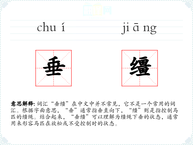 词汇“垂缰”在中文中并不常见,它不是一个常用的词汇。根据字面意思,“垂”通常指垂直向下,“缰”则是指控制马匹的缰绳。结合起来,“垂缰”可以理解为缰绳下垂的状态,通常用来形容马匹在放松或不受控制时的状态。