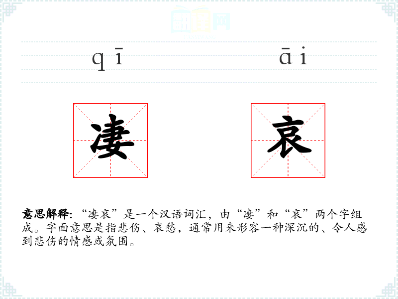 “凄哀”是一个汉语词汇,由“凄”和“哀”两个字组成。字面意思是指悲伤、哀愁,通常用来形容一种深沉的、令人感到悲伤的情感或氛围。