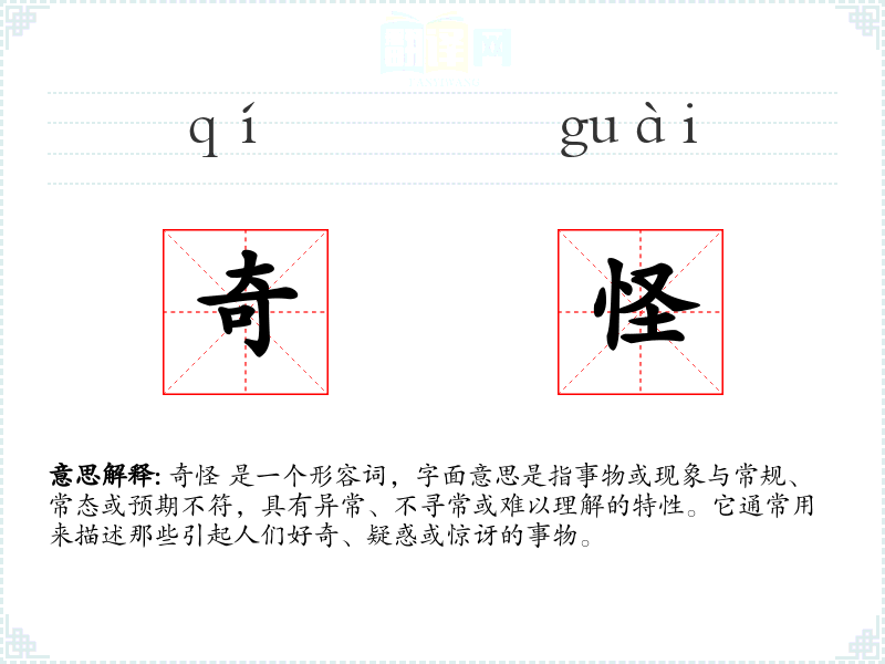 奇怪 是一个形容词,字面意思是指事物或现象与常规、常态或预期不符,具有异常、不寻常或难以理解的特性。它通常用来描述那些引起人们好奇、疑惑或惊讶的事物。