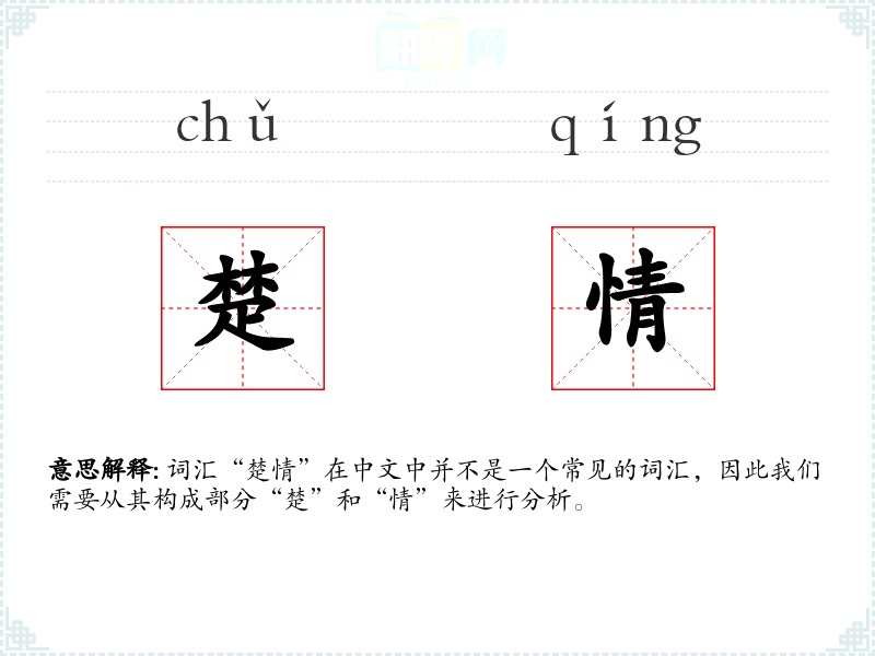 - 词源:“楚”源自古代楚国,“情”源自情感。