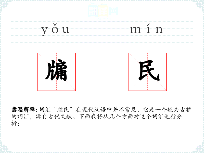 词汇“牖民”在现代汉语中并不常见,它是一个较为古雅的词汇,源自古代文献。下面我将从几个方面对这个词汇进行分析: