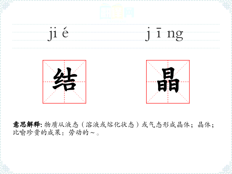 物质从液态(溶液或熔化状态)或气态形成晶体;晶体;比喻珍贵的成果:劳动的~。