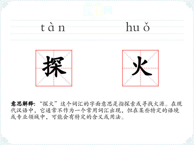 “探火”这个词汇的字面意思是指探索或寻找火源。在现代汉语中,它通常不作为一个常用词汇出现,但在某些特定的语境或专业领域中,可能会有特定的含义或用法。