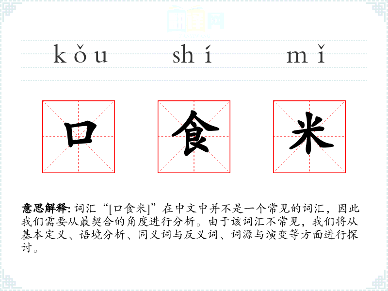 词汇“[口食米]”在中文中并不是一个常见的词汇,因此我们需要从最契合的角度进行分析。由于该词汇不常见,我们将从基本定义、语境分析、同义词与反义词、词源与演变等方面进行探讨。