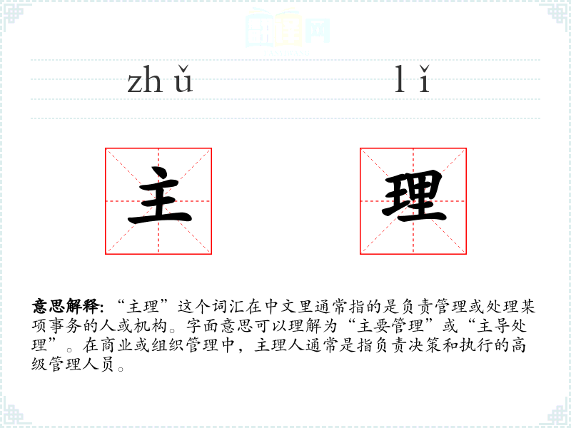 “主理”这个词汇在中文里通常指的是负责管理或处理某项事务的人或机构。字面意思可以理解为“主要管理”或“主导处理”。在商业或组织管理中,主理人通常是指负责决策和执行的高级管理人员。