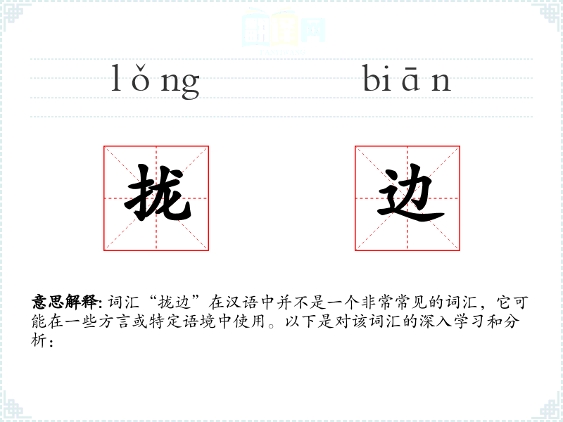 词汇“拢边”在汉语中并不是一个非常常见的词汇,它可能在一些方言或特定语境中使用。以下是对该词汇的深入学习和分析: