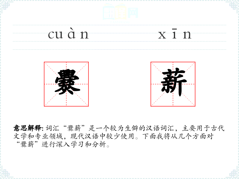词汇“爨薪”是一个较为生僻的汉语词汇,主要用于古代文学和专业领域,现代汉语中较少使用。下面我将从几个方面对“爨薪”进行深入学*和分析。