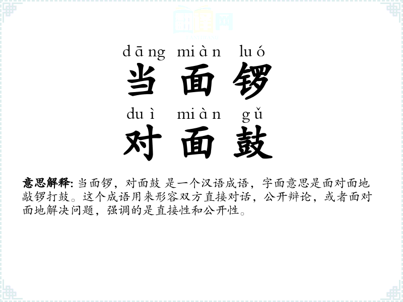 当面锣,对面鼓 是一个汉语成语,字面意思是面对面地敲锣打鼓。这个成语用来形容双方直接对话,公开辩论,或者面对面地解决问题,强调的是直接性和公开性。