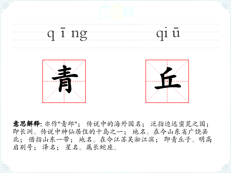1.亦作"青邱"; 传说中的海外国名; 泛指边远蛮荒之国; 即长洲。传说中神仙居住的十岛之一; 地名。在今山东省广饶县北; 借指山东一带; 地名。在今江苏吴淞江滨; 即青丘子。明高启别号; 泽名; 星名。属长蛇座。