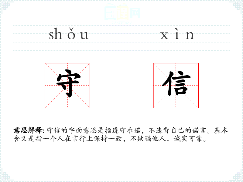 守信的字面意思是指遵守承诺,不违背自己的诺言。基本含义是指一个人在言行上保持一致,不欺骗他人,诚实可靠。
