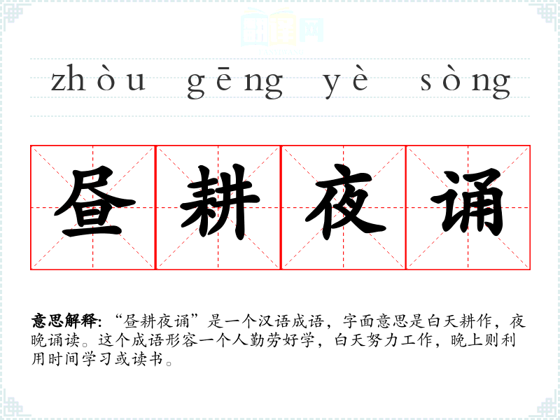 “昼耕夜诵”是一个汉语成语,字面意思是白天耕作,夜晚诵读。这个成语形容一个人勤劳好学,白天努力工作,晚上则利用时间学*或读书。