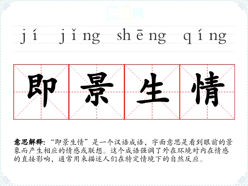 “即景生情”是一个汉语成语,字面意思是看到眼前的景象而产生相应的情感或联想。这个成语强调了外在环境对内在情感的直接影响,通常用来描述人们在特定情境下的自然反应。