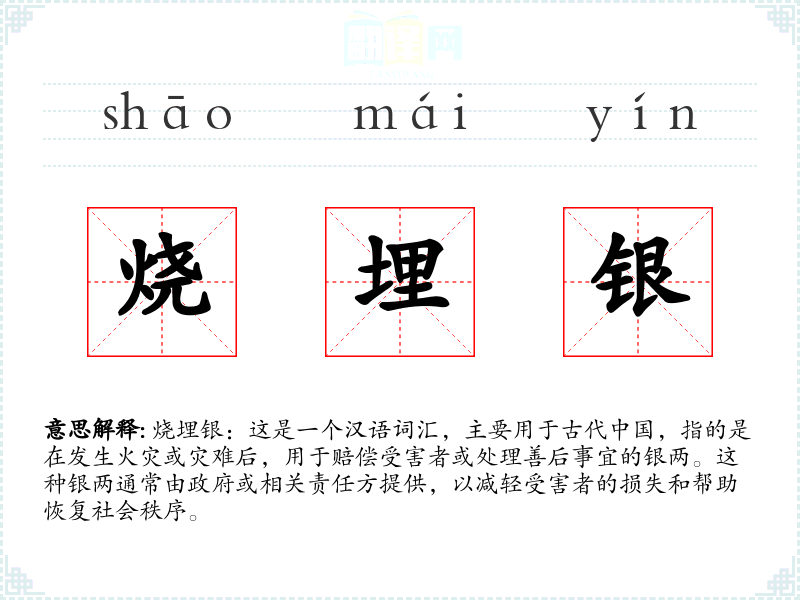 烧埋银:这是一个汉语词汇,主要用于古代**,指的是在发生火灾或灾难后,用于赔偿受害者或处理善后事宜的银两。这种银两通常由政府或相关责任方提供,以减轻受害者的损失和帮助恢复社会秩序。