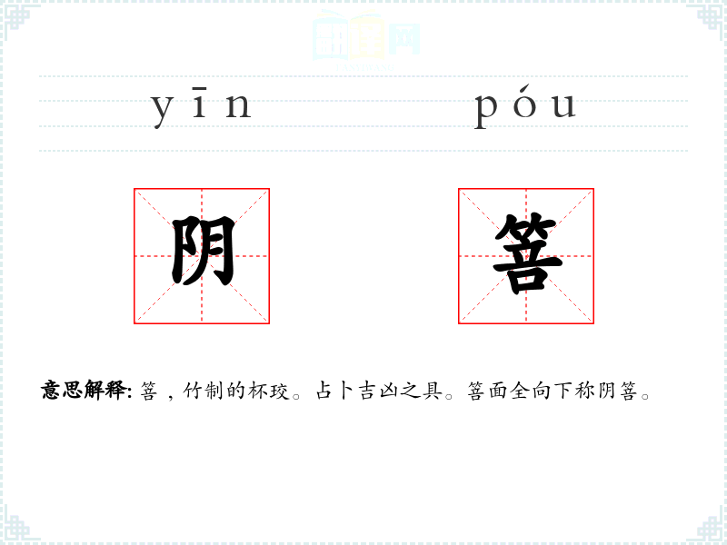 箁﹐竹制的杯珓。占卜吉凶之具。箁面全向下称阴箁。