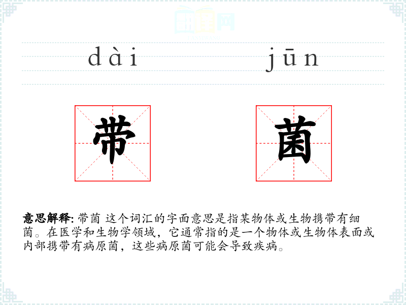 带菌 这个词汇的字面意思是指某物体或生物携带有细菌。在医学和生物学领域,它通常指的是一个物体或生物体表面或内部携带有病原菌,这些病原菌可能会导致疾病。
