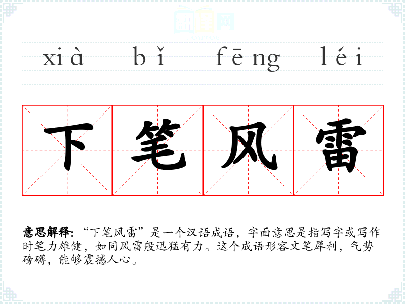 “下笔风雷”是一个汉语成语,字面意思是指写字或写作时笔力雄健,如同风雷般迅猛有力。这个成语形容文笔犀利,气势磅礴,能够震撼人心。