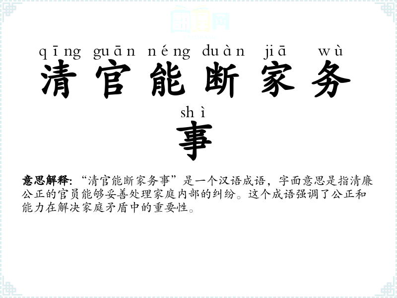 “清官能断家务事”是一个汉语成语,字面意思是指清廉公正的官员能够妥善处理家庭内部的纠纷。这个成语强调了公正和能力在解决家庭矛盾中的重要性。