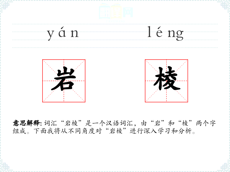 “岩”字古已有之,指坚硬的石头或山石;“棱”字则指物体的边缘或棱角。两个字组合成“岩棱”,强调岩石的边缘特征。