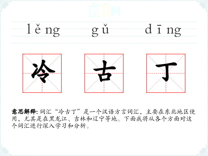 词汇“冷古丁”是一个汉语方言词汇,主要在东北地区使用,尤其是在黑龙江、吉林和辽宁等地。下面我将从各个方面对这个词汇进行深入学习和分析。