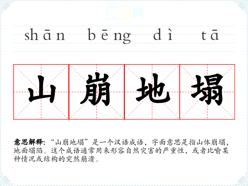 “山崩地塌”是一个汉语成语,字面意思是指山体崩塌,地面塌陷。这个成语通常用来形容自然灾害的严重性,或者比喻某种情况或结构的突然崩溃。