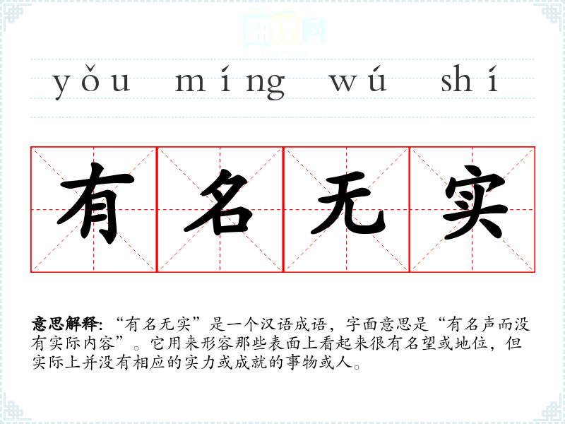 “有名无实”是一个汉语成语,字面意思是“有名声而没有实际内容”。它用来形容那些表面上看起来很有名望或地位,但实际上并没有相应的实力或成就的事物或人。