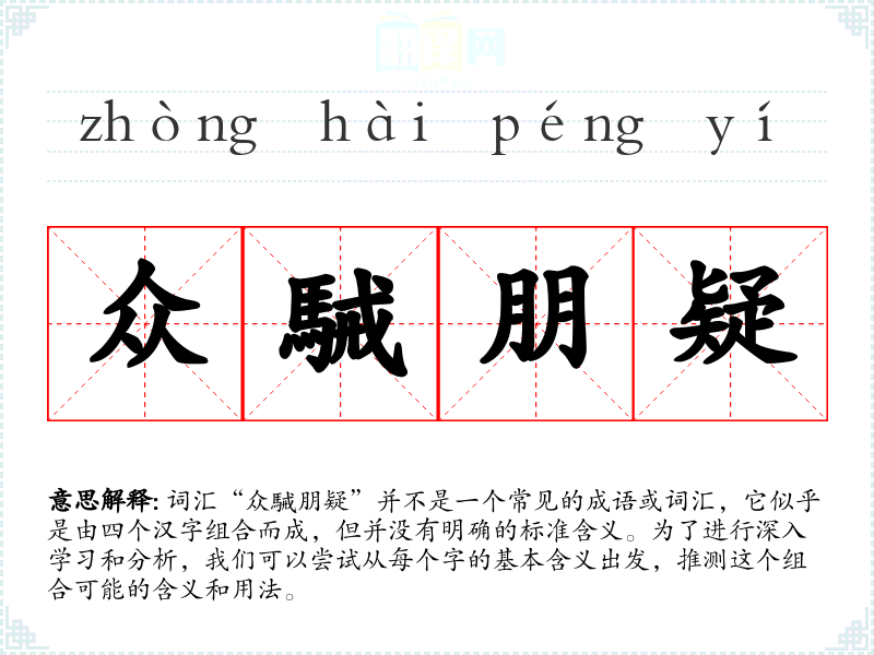 词汇“众駴朋疑”并不是一个常见的成语或词汇,它似乎是由四个汉字组合而成,但并没有明确的标准含义。为了进行深入学*和分析,我们可以尝试从每个字的基本含义出发,推测这个组合可能的含义和用法。