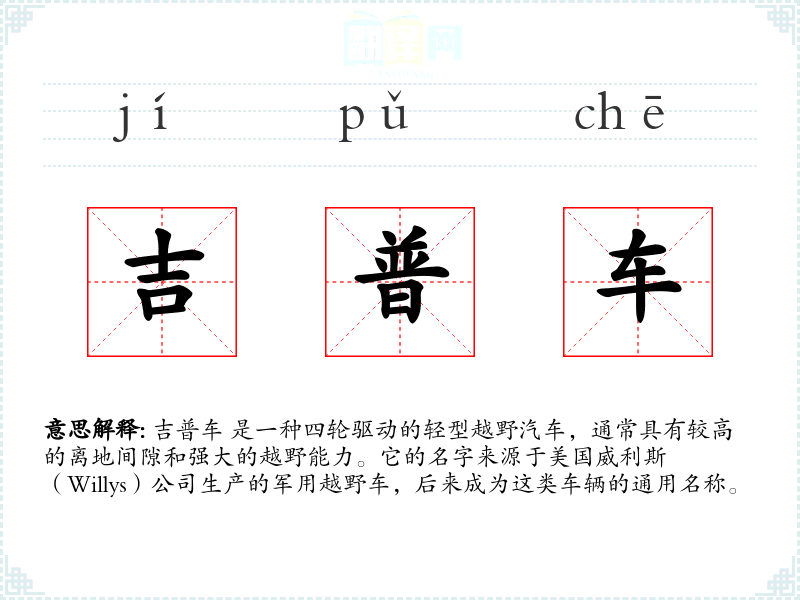 "吉普车"的意思解释、吉普车是什么意思由翻译网汉语词典查词提供。