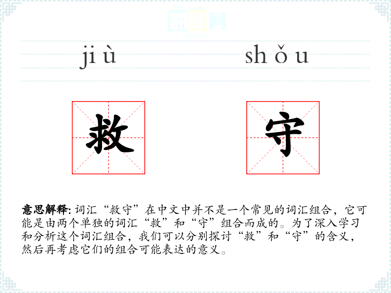 词汇“救守”在中文中并不是一个常见的词汇组合,它可能是由两个单独的词汇“救”和“守”组合而成的。为了深入学*和分析这个词汇组合,我们可以分别探讨“救”和“守”的含义,然后再考虑它们的组合可能表达的意义。