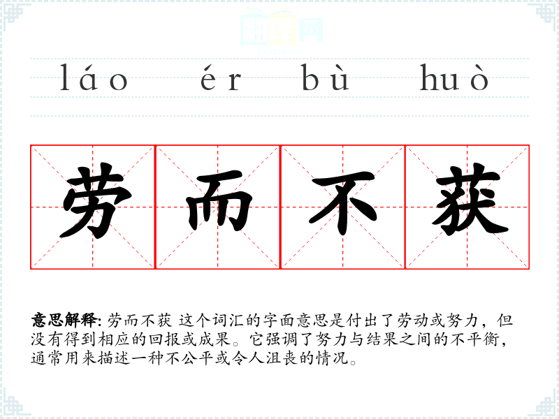 劳而不获 这个词汇的字面意思是付出了劳动或努力,但没有得到相应的回报或成果。它强调了努力与结果之间的不平衡,通常用来描述一种不公平或令人沮丧的情况。