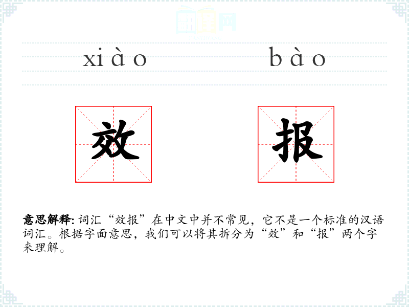 词汇“效报”在中文中并不常见,它不是一个标准的汉语词汇。根据字面意思,我们可以将其拆分为“效”和“报”两个字来理解。