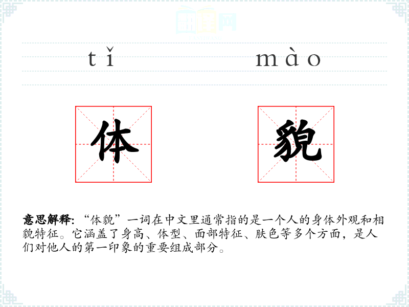 “体貌”一词由“体”和“貌”两个字组成。在古代汉语中,“体”指身体,“貌”指外观或相貌。随着语言的发展,这两个字结合在一起,形成了现代汉语中的“体貌”一词。