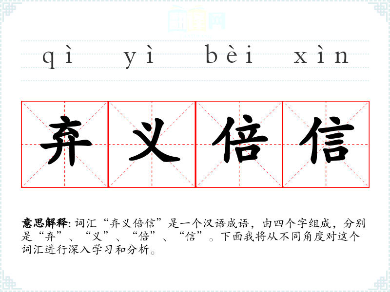 词汇“弃义倍信”是一个汉语成语,由四个字组成,分别是“弃”、“义”、“倍”、“信”。下面我将从不同角度对这个词汇进行深入学*和分析。