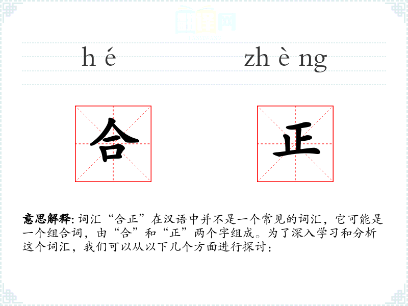 词汇“合正”在汉语中并不是一个常见的词汇,它可能是一个组合词,由“合”和“正”两个字组成。为了深入学习和分析这个词汇,我们可以从以下几个方面进行探讨: