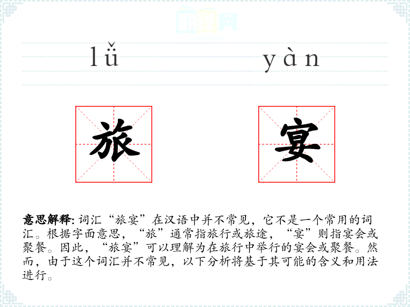 词汇“旅宴”在汉语中并不常见,它不是一个常用的词汇。根据字面意思,“旅”通常指旅行或旅途,“宴”则指宴会或聚餐。因此,“旅宴”可以理解为在旅行中举行的宴会或聚餐。然而,由于这个词汇并不常见,以下分析将基于其可能的含义和用法进行。