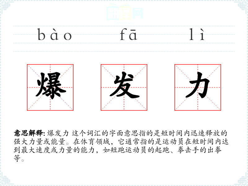 爆发力 这个词汇的字面意思指的是短时间内迅速释放的强大力量或能量。在体育领域,它通常指的是员在短时间内达到最大速度或力量的能力,如短跑员的起跑、拳击手的出拳等。
