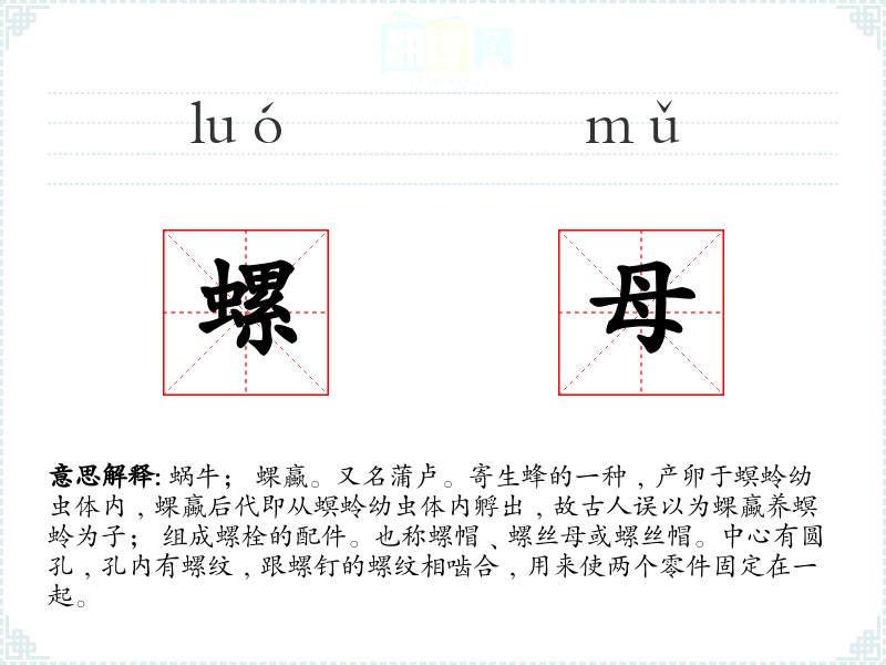 1.蜗牛; 蜾蠃。又名蒲卢。寄生蜂的一种﹐产卵于螟蛉幼虫体内﹐蜾蠃后代即从螟蛉幼虫体内孵出﹐故古人误以为蜾蠃养螟蛉为子; 组成螺栓的配件。也称螺帽﹑螺丝母或螺丝帽。中心有圆孔﹐孔内有螺纹﹐跟螺钉的螺纹相啮合﹐用来使两个零件固定在一起。