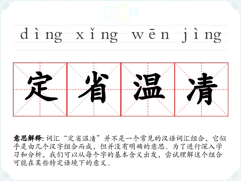 词汇“定省温凊”并不是一个常见的汉语词汇组合,它似乎是由几个汉字组合而成,但并没有明确的意思。为了进行深入学习和分析,我们可以从每个字的基本含义出发,尝试理解这个组合可能在某些特定语境下的意义。