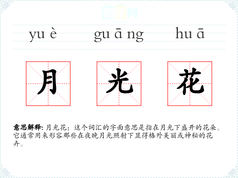 月光花:这个词汇的字面意思是指在月光下盛开的花朵。它通常用来形容那些在夜晚月光照射下显得格外美丽或神秘的花卉。