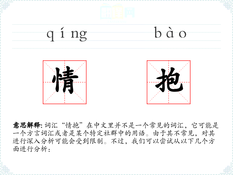由于“情抱”不是一个标准词汇,它在不同语境下的使用可能非常有限。在文学作品中,如果出现这个词,可能是为了营造一种特定的情感氛围或者表达一种深层的情感交流。