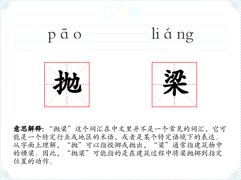 由于“抛梁”不是一个常见的词汇,它在不同的语境下可能有着不同的含义。在建筑行业中,它可能指的是一种特定的施工方法,即通过机械或其他方式将梁材抛掷到建筑物的预定位置。在文学或口语中,如果没有特定的上下文,这个词汇可能不太容易被理解。
