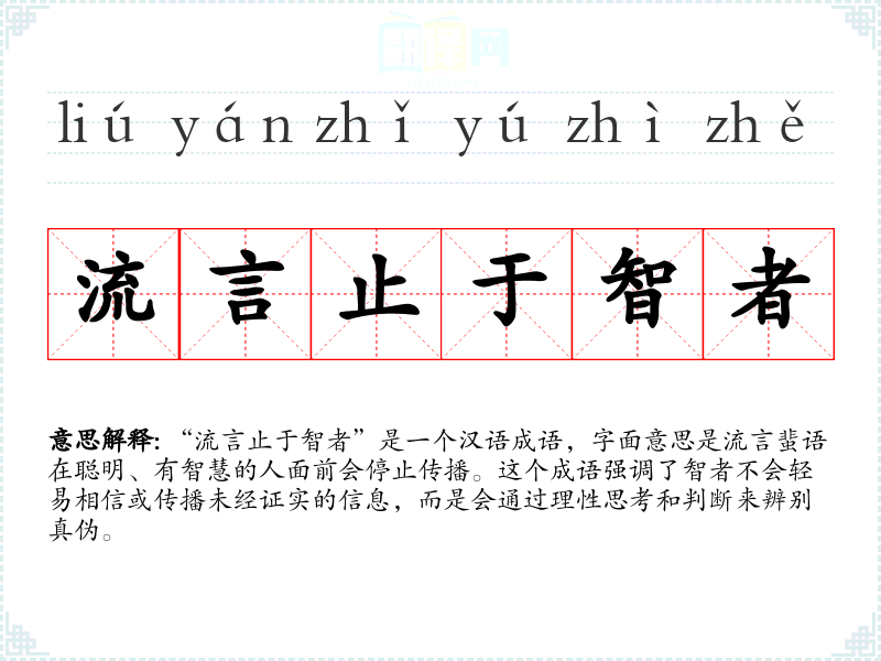 “流言止于智者”是一个汉语成语,字面意思是流言蜚语在聪明、有智慧的人面前会停止传播。这个成语强调了智者不会轻易相信或传播未经证实的信息,而是会通过理性思考和判断来辨别真伪。