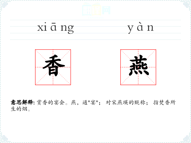 赏香的宴会。燕,通"宴"; 对宋燕瑛的贬称; 指焚香所生的烟。