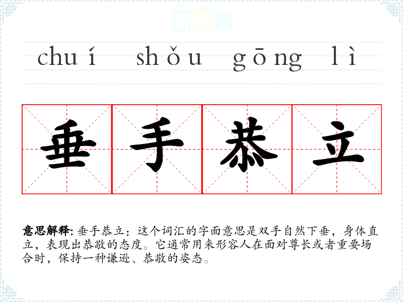 垂手恭立:这个词汇的字面意思是双手自然下垂,身体直立,表现出恭敬的态度。它通常用来形容人在面对尊长或者重要场合时,保持一种谦逊、恭敬的姿态。