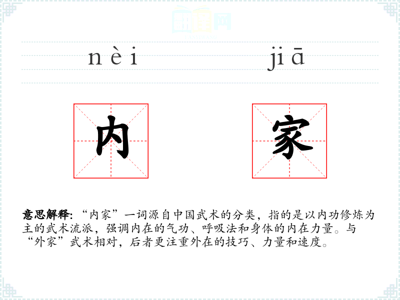 “内家”一词源自**武术的分类,指的是以内功修炼为主的武术流派,强调内在的气功、呼吸法和身体的内在力量。与“外家”武术相对,后者更注重外在的技巧、力量和速度。